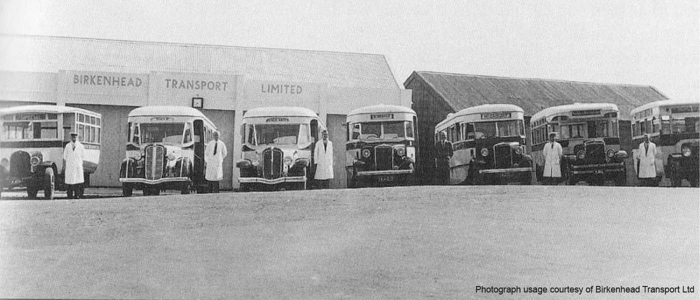Photograph above: A line up of pre-war buses outside the historic Verran’s Corner Depot in Birkenhead (1937).